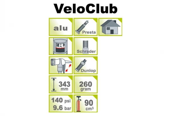 La « VeloClub » est une Mini pompe en aluminium avec poignée en T et indicateur de pression. Elle se glisse facilement dans un sac d’hydratation ou se fixer sur les vis porte bidon de votre cadre grace à son support spécifique, et offre sur le terrain des performances et une facilité de gonflage largement supérieure aux pompes à main classique. Compatibles avec les valves Presta/ Shrader/ Dunlop. Pression de gonflage jusqu’à 140PSI, 9.6bar (compatible avec les vélos de route)