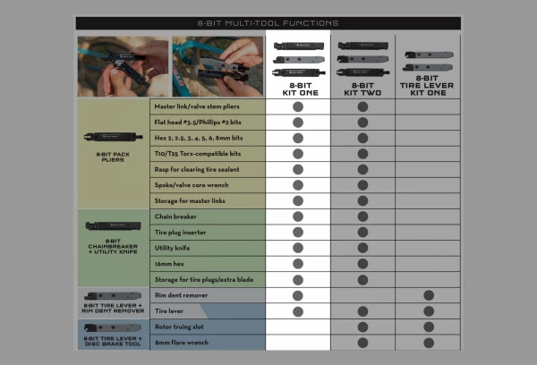 - 8-Bit Chainbreaker + Utility Knife Multi-tool (4 fonctions). Il comporte un dérive-chaîne à une extrémité et une lame de cutter rétractable à l’autre. Le dérive-chaîne est actionné par une clé en L hexagonale de 3 mm (incluse) qui sert également d’outil d’insertion pour mèche tubeless. Une fente usinée permet d’insérer la clé en L et de transformer l’ensemble en un outil de réparation pour pneu tubeless, l’extrémité fourchue de la clé en L s’étendant vers l’extérieur. Les poignées de cet outil s’ouvrent par glissement pour permettre de ranger les mèches tubeless, un obus de valve et une mini-lame de cutter de rechange. La quatrième fonction est la tête dérive-chaîne de 16 mm qui peut être utilisée pour serrer un bras de manivelle desserré pendant les randonnées.
