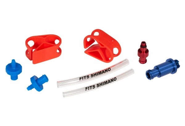 Ce kit se compose d’une paire de seringue spéciale huile minérale, des embouts de purge spécifiques Shimano avec leurs flexibles ainsi que d’un bidon de 100 ml d’huile minérale Elvedes.