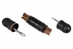 Le kit de réparation tubeless Sahmurai SWORD se range astucieusement dans votre cintre, toujours prêt à servir même perdu au find fond des bois sans votre sac !