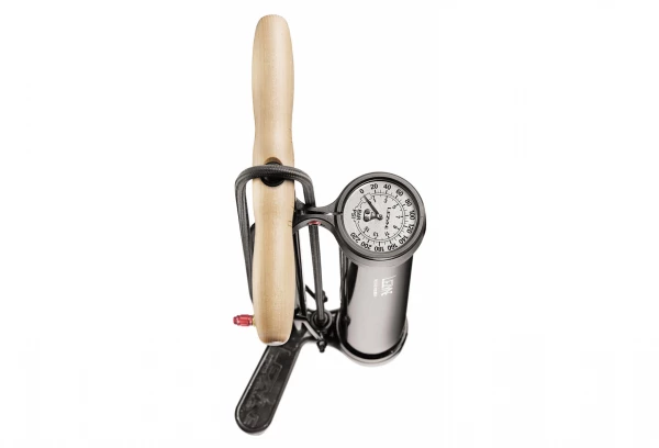 Pompe à pieds innovatrice avec système intégré conçu pour mettre en place les pneus tubeless. Une chambre secondaire peut être manuellement pressurisée et la pédale en acier inoxydable libère l’air comprimé. Libérant ainsi une forte et continue quantité d’air qui plaque les tringles des pneus tubeless. Manomètre analogique précis. Construction durable en acier et aluminium avec élégante poignée en bois.