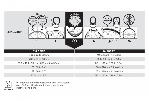 - Compatible avec le gonflage par CO2, uniquement pour une réparation d’urgence sur le terrain : le CO2 accélère la coagulation. Doit être remplacé par la suite.